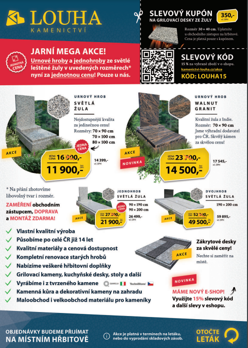 Součástí je také slevový kupon v letáku viz. níže, který je možné využít v našem e-shopu kamenictvi-louha.cz