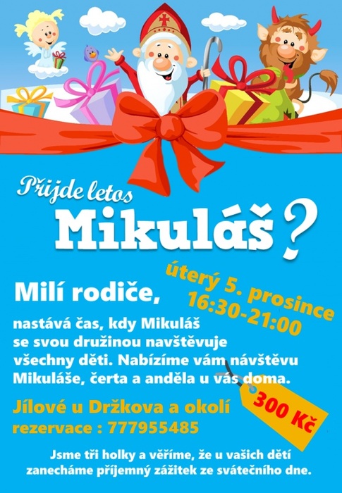 nastává čas, kdy Mikuláš se svou družinou navštěvuje všechny děti. Nabízíme Vám návštěvu Mikuláše, čerta a anděla u vás doma.