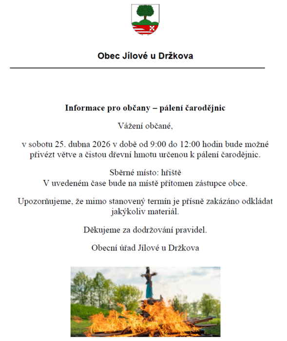 Oznámení o možnosti dovozu větví na akci pálení čarodějnic