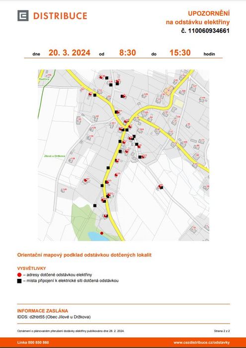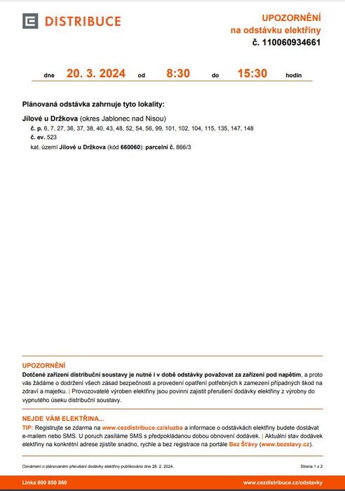 Oznámení o přerušení dodávky elektrické energie č. 110060934661