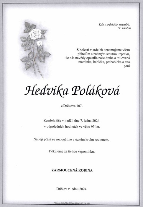 Oznámení o úmrtí - paní Hedvika Poláková z Držkova č.p. 107.