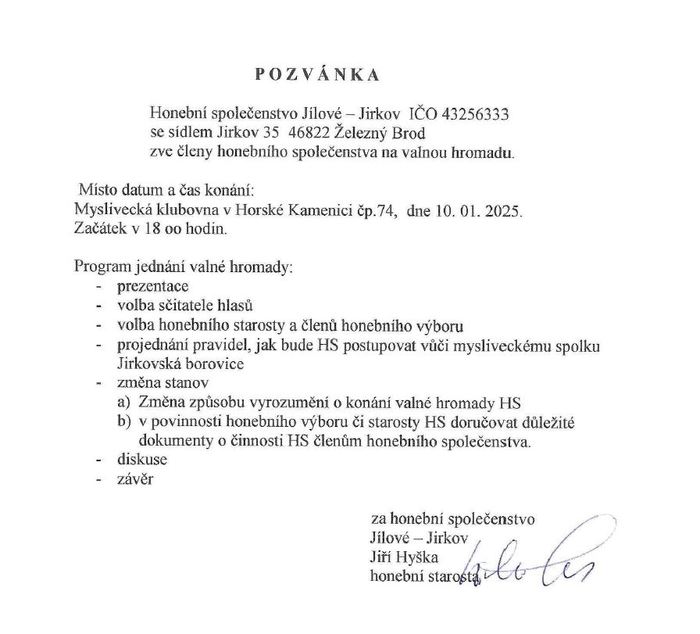 Úvod > Obecní úřad > Aktuality > Pozvánka na valnou hromadu honebního společenstva Jílové - Jirkov dne 10.1.2025