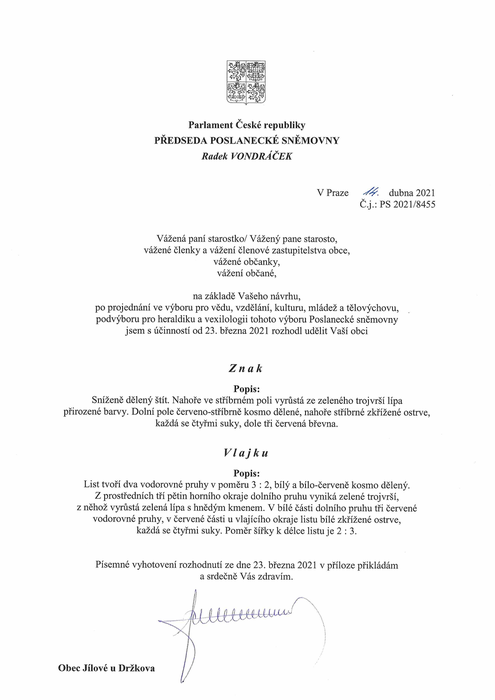 Rozhodnutím č. 105 předsedy Poslanecké sněmovny Mgr. Radka Vondráčka ze dne 23. března 2021 získala obec Jílové u Držkova nově právo používat svoji vlajku a znak.
